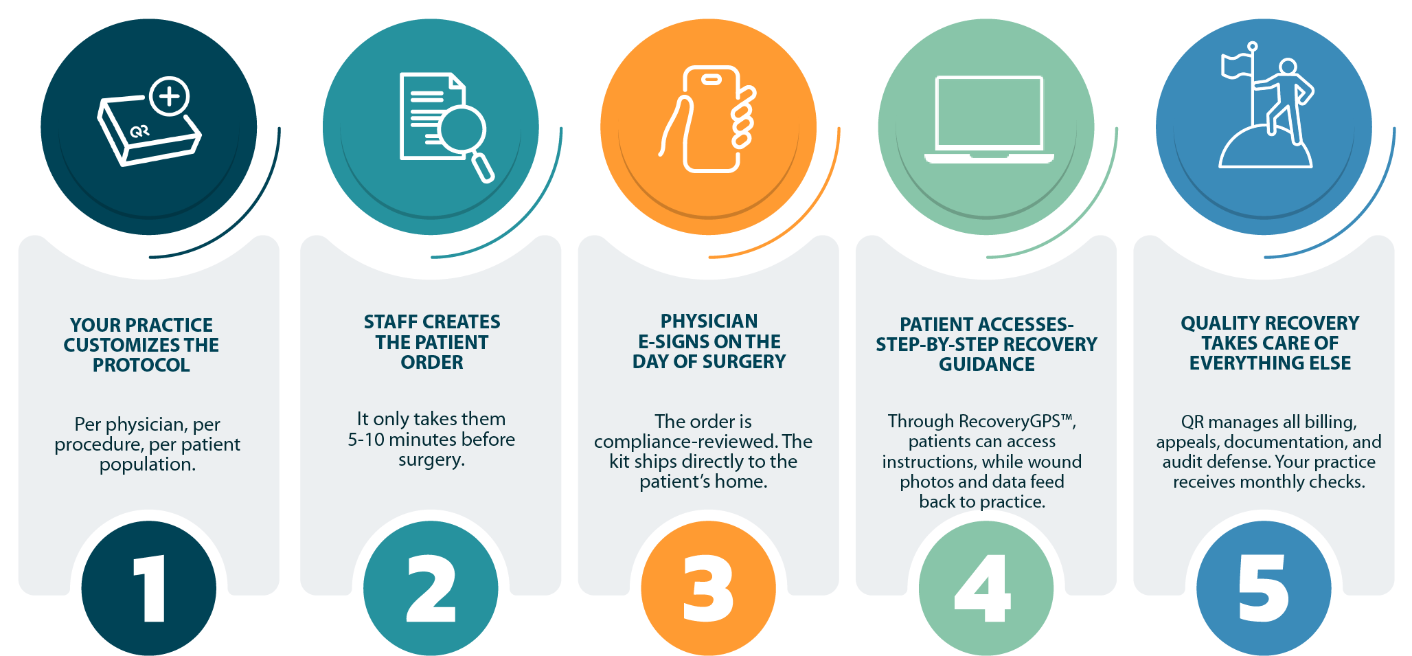 QR is not a kit company. It is a complete operating system for the post-discharge phase of care — built to run with minimal staff time, maximum compliance rigor, and zero billing burden on your practice. We offer a genuinely turnkey system: the workflow is designed before the surgery, not improvised after.